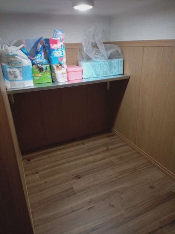 床材はわんちゃんが滑りにくく安全に過ごせるよう、サンゲツのペット用クッションフロアを、一部壁には調湿機能をもつ内装タイルのエコカラットをご提案させていただきました。配線類は安全面を考慮し、ワンちゃんの届かない位置へ移設し、奥のスペースには収納棚を設け、お掃除道具なども置けるよう工夫させていただきました。