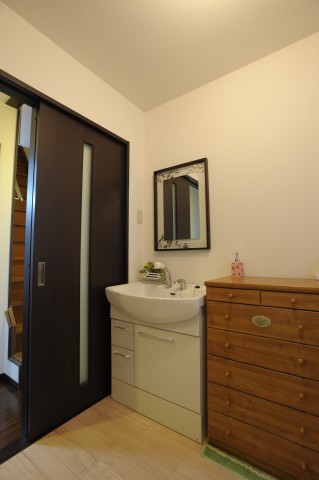 洗面脱衣スペースがない状態でした。今回、水まわりスペース移動に伴い、洗面脱衣室を新たに設置しました。シンプルにベースキャビネットのみ、お好みのミラーを取り付けられました。