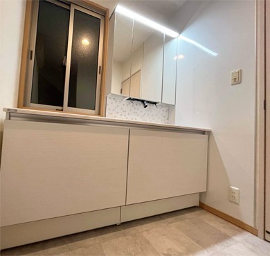 ご家族皆様で快適にお使いいただけるよう、従来の幅750mmから大幅にサイズアップした**LIXILのルミシス(幅1650mm)**をご提案いたしました。広くなった洗面台と、一新した壁紙・床材で、洗面室の雰囲気がガラッと変わり、私も大変嬉しく思っております。