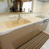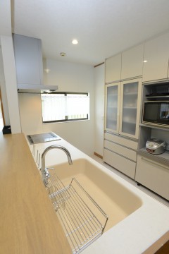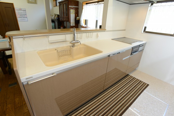 家族の方を向いて家事ができたらもっといいのにというお母様のご希望に沿って、L型背面キッチンから対面キッチンへ間取り変更のご提案をしました。サイドキャビネットもキッチン本体と同じ扉の収納をぴったり配置し、すっきり納まりました。