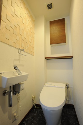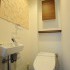 限られた空間を最大限利用する為、タンクレストイレを採用。梁壁間のデットスペースは収納に。ボトルトラップやニッチ、壁面タイル等ミニマム空間ながらもインテリア性を高める工夫をしました。