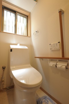 トイレの出入り口には段差があり、躓きやトイレ使用時の立ち座りにも不安がありました。トイレ前方スペースに余裕をもたせ、今後排せつの手助けが必要になった際も作業をしやすく、またお客様の使いやすい位置に合わせた手摺の設置で、より安全に快適にトイレをが使用できるようになりました。