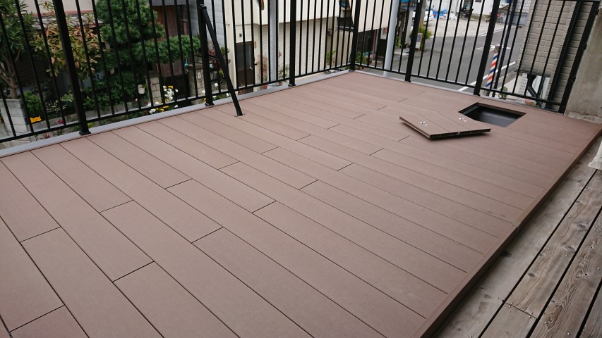 リフォームのご相談をしていく中で、木製ウッドデッキは雨等で劣化しやすいため、樹脂製のデッキ材でご提案させていただきました 。
