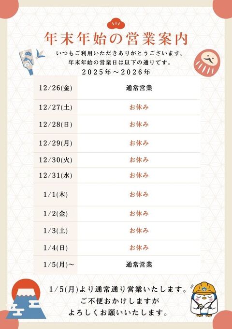 休業時間中に頂いたメール又は留守番電話でのお問い合わせにつきましては、