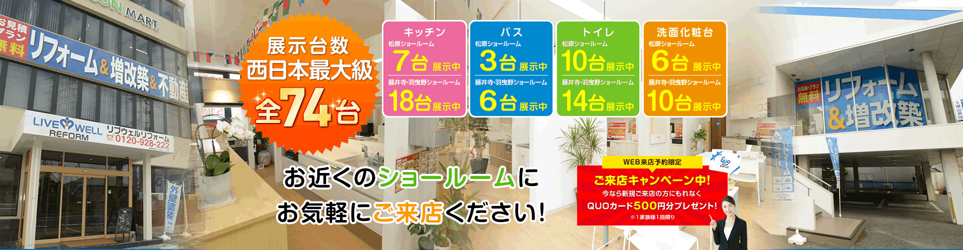 藤井寺市・羽曳野市のリフォーム&増改築専門店のリブウェルリフォーム! キッチン12台、お風呂6台、トイレ14台、洗面台10台の全42台を実物展示しております! 見るだけ、聞くだけ大歓迎です!ご来店お待ちしております!